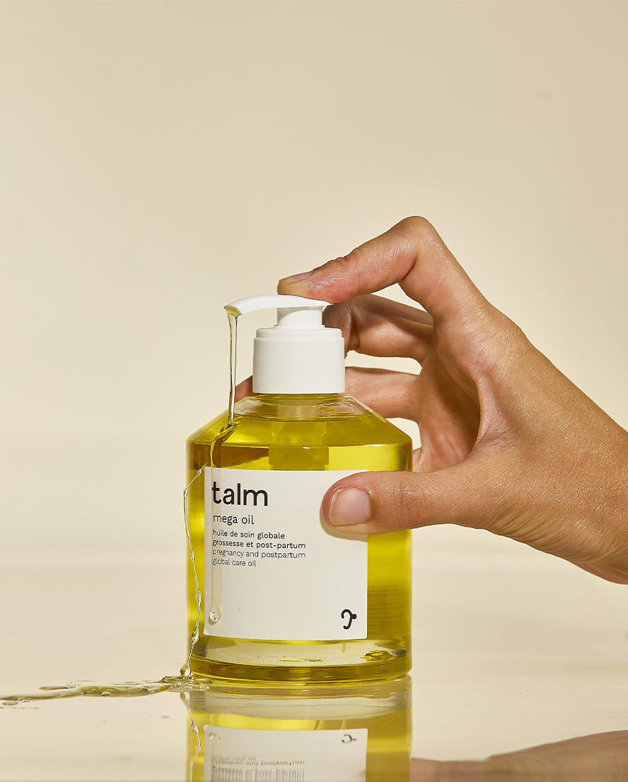 Mega Oil accompagne la peau pendant la grossesse et le post-partum, sur le corps, le visage et désormais la zone périnéale, avec 7 usages différents.